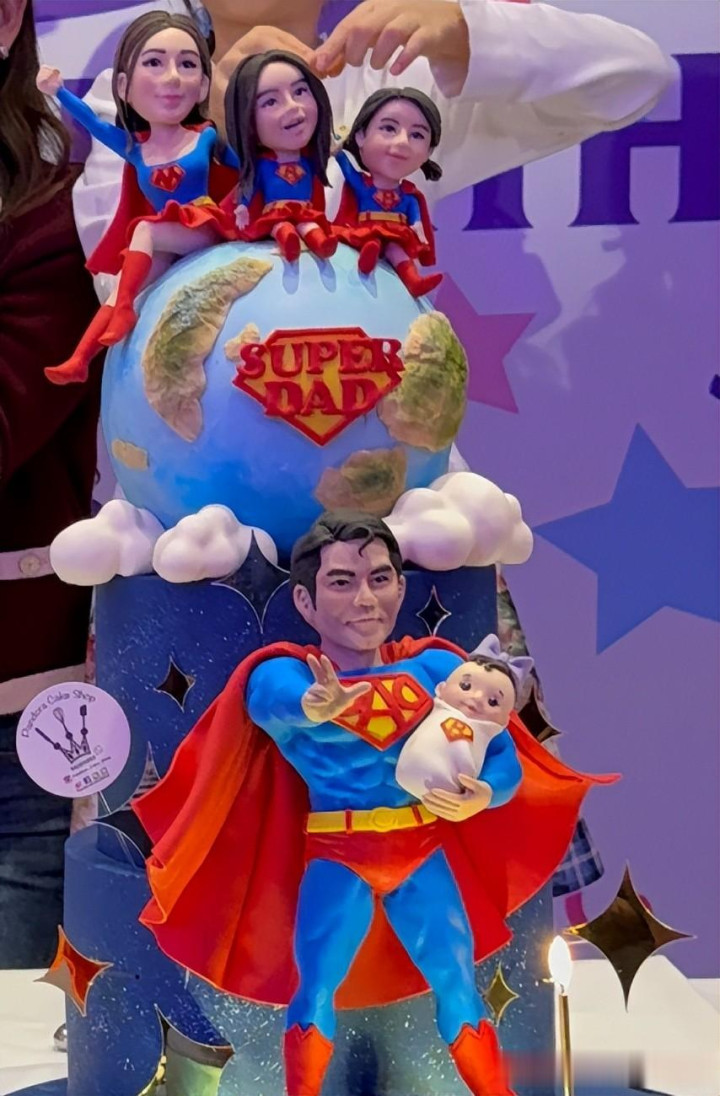 这一次在生日蛋糕上,郭富城变身超人,怀里还抱着一个婴儿,象征着刚刚出生的三妹,方媛则带着两个女儿“坐在”蛋糕的最顶上,一家五口人团圆。