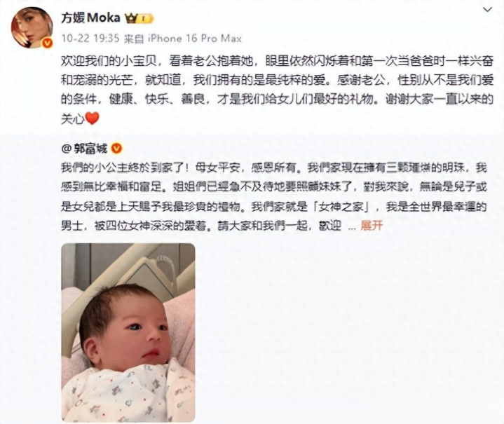 方媛给郭富城又生了一个女儿,天王一下拥有三个千金,一家五口人幸福美满了。